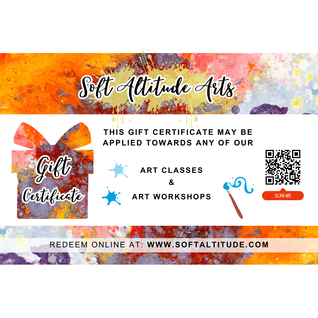 You may purchase a Soft Altitude Arts gift certificate in any denomination of your choice, which can be used towards any of our classes or workshops.